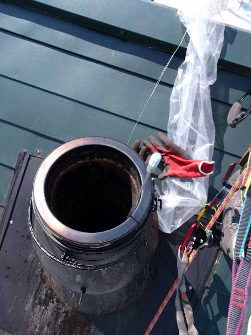 昨日、お客様から緊急の連絡をいただきお客様宅に出動。薪ストーブの燃えが悪く煙が逆流するというのです。まあ、こんなときはほぼ煙突の詰まり。特にトップの鳥よけ網の詰まりです。お客様の煙突は屋根30°勾配以上で寒冷地、そして前日は20センチの積雪です。傾斜があるので屋根には積もっていませんが、濡れていても大変危険です。当日は幸い晴れて屋根は乾いておりました。しかし、安全のため屋根に登るにはザイル、ハーネス、登高器、スリング、カラビナ等の一式が必要です。